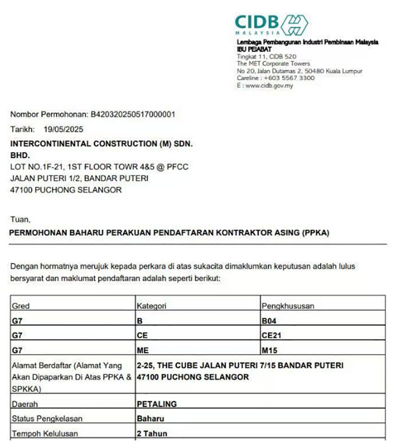 此次取得的G7施工資質(zhì)是CIDB許可的“競標能力”價額無封頂、無上限的施工資質(zhì),意味著今后洲際建設在馬來西亞承接工程將不再受項目規(guī)模、合同金額以及類型限制。